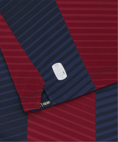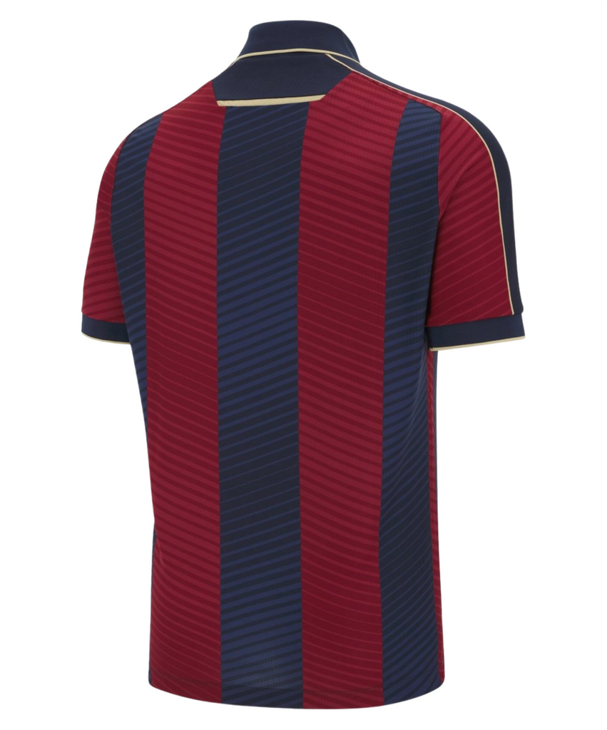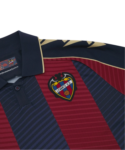 Das Heimtrikot von Levante zeigt vertikale Streifen in Marineblau und Bordeauxrot, betont durch dezente diagonale Linien innerhalb der Streifen. Der klassische Polokragen in Marineblau ist mit einem feinen goldenen Rand versehen, ebenso wie die Ärmelabschlüsse – ein elegantes, retro-inspiriertes Detail. Auf beiden Schultern befinden sich drei goldene Macron-Logos, während das goldene Macron-Logo auf der rechten Brust prangt und das Vereinswappen des Levante UD stolz auf der linken Seite angebracht ist.