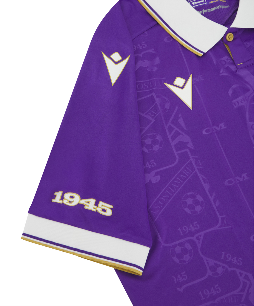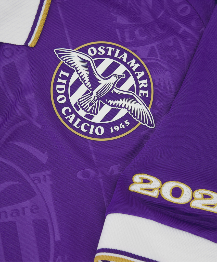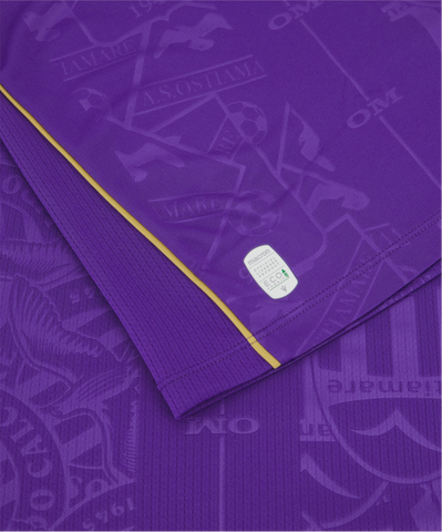 La primera equipación de Ostiamare para la temporada 2025/26 es un poderoso símbolo del orgullo del club, de su historia y de un diseño contemporáneo. Esta camiseta oficial de Ostia Mare Lido rinde homenaje a la identidad profundamente arraigada del club mediante un diseño elegante y significativo que fusiona elementos tradicionales con detalles modernos. El característico color púrpura del equipo domina la prenda, realzado por sutiles acentos dorados y blancos que aportan una estética refinada. Lo que realmente distingue a esta primera equipación es el patrón en relieve 3D que recorre su superficie y narra visualmente la historia de la ciudad de Ostia y el orgullo de su equipo de fútbol. Cada detalle está cuidadosamente pensado, como la inscripción bordada “9 OTTOBRE 1945” en la parte posterior del cuello — una referencia clara al año de fundación del club, una fecha que tiene un profundo significado para todos los aficionados de Ostiamare.