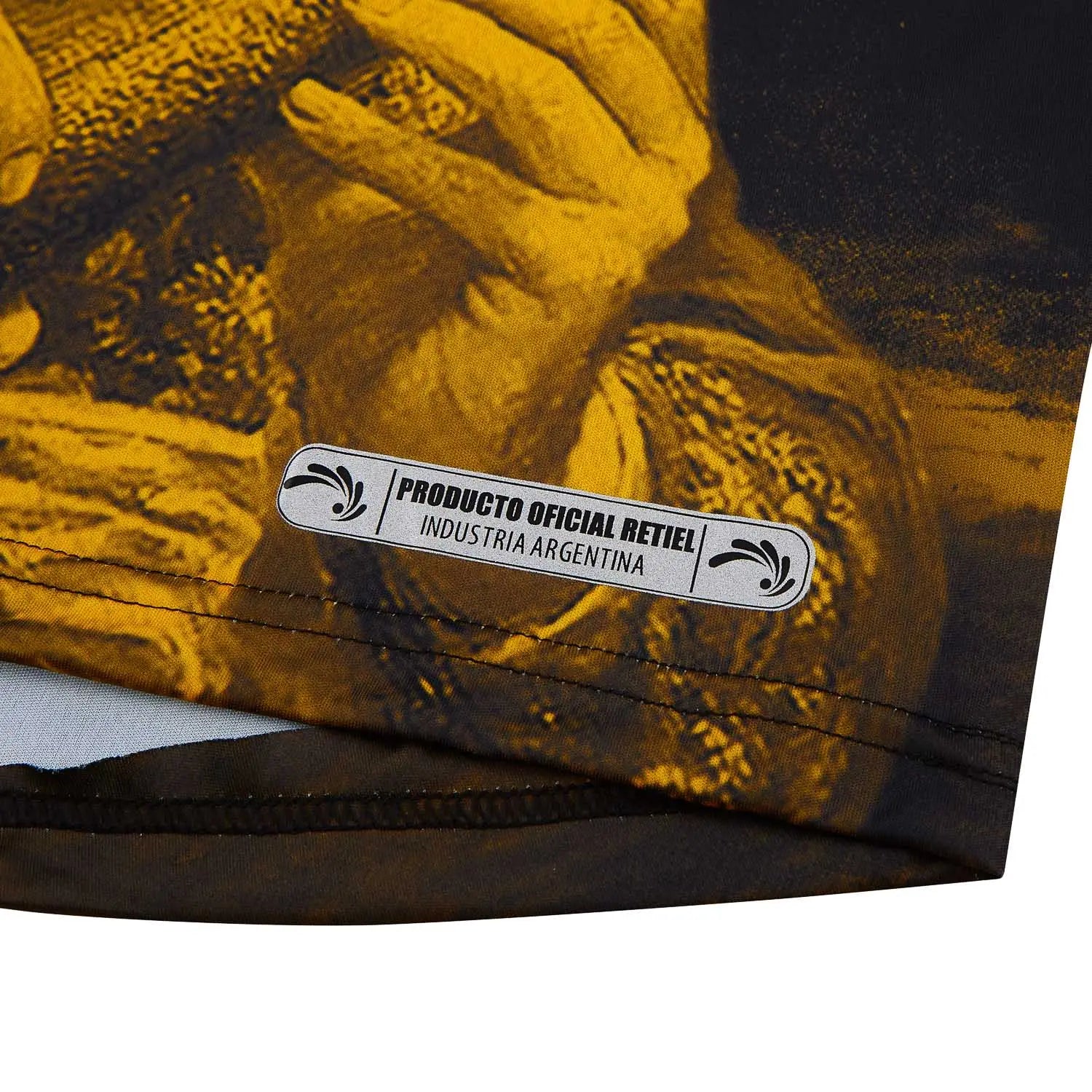 Het ontwerp bevat krachtige maritieme details, waaronder een subtiel patroon geïnspireerd op historische marine-uniformen in de mouwen en een gedetailleerde schipgrafiek op de rugzijde. De borst is voorzien van een artistiek portret van Guillermo Brown, wat het shirt een unieke historische waarde geeft. De rijke kleuren en accenten roepen direct het tijdperk op waarin Brown vocht voor de onafhankelijkheid van zijn land.