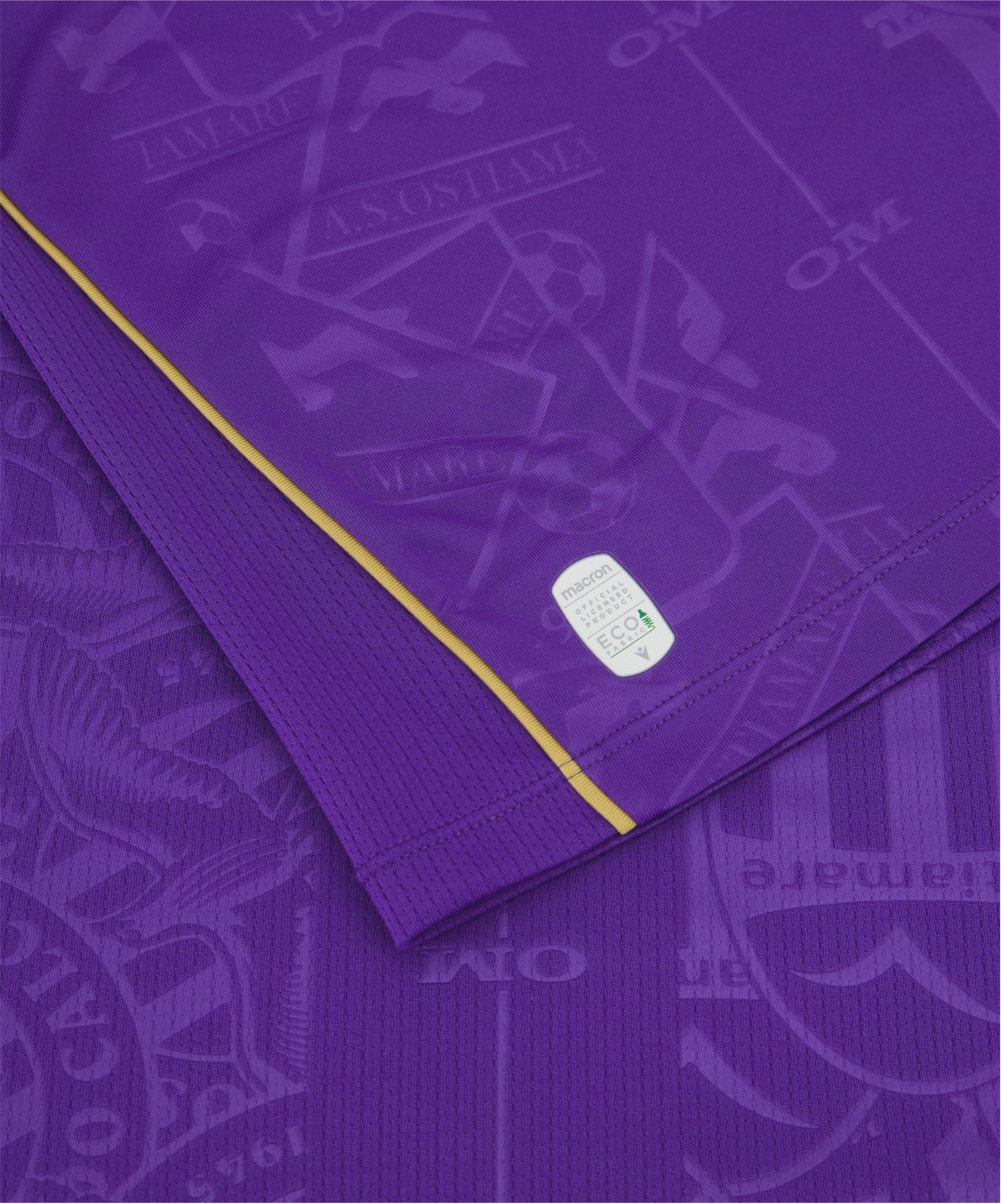 Het Ostiamare thuisshirt voor het seizoen 2025/26 is een krachtig symbool van clubtrots, geschiedenis en modern design. Dit officiële thuisshirt van Ostia Mare Lido eert de diepgewortelde identiteit van de club met een stijlvol en betekenisvol ontwerp dat zowel traditionele elementen als eigentijdse details samenbrengt. De karakteristieke paarse kleur van de club vormt de basis van het shirt, verfijnd met subtiele gouden en witte accenten die het een elegante uitstraling geven. Wat het shirt echt uniek maakt, is het 3D-reliëfpatroon dat subtiel over het oppervlak loopt en een visueel verhaal vertelt over de stad Ostia en de trots van haar voetbalteam. Elk detail van dit shirt is doordacht vormgegeven, tot aan de achterkant van de kraag waar de geborduurde inscriptie “9 OTTOBRE 1945” te vinden is. Dit is een duidelijke verwijzing naar het oprichtingsjaar van de club, een datum die voor elke Ostiamare-supporter diepe betekenis heeft.